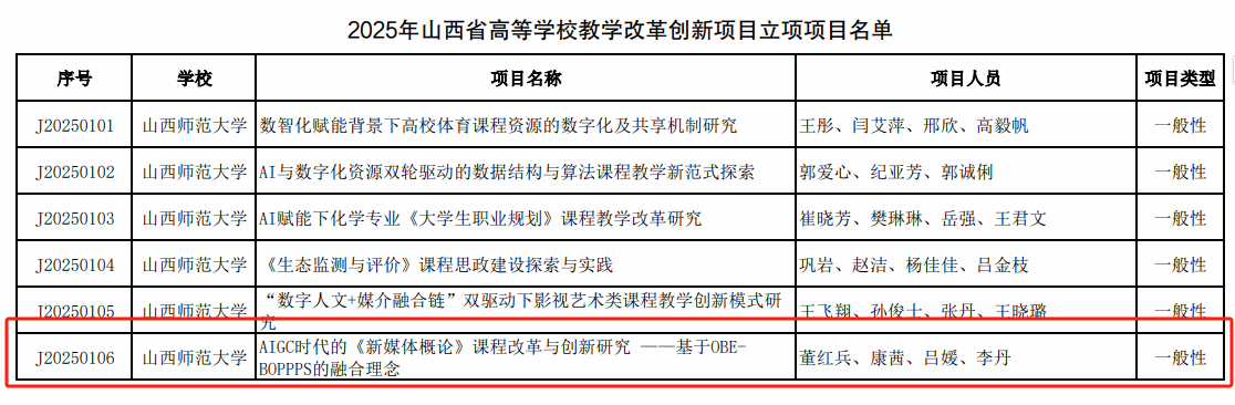 近日,山西省教育厅和我校教务部先后公布2025年度教改项目立项名单,我院董红兵、吕培铭老师项目获准立项。