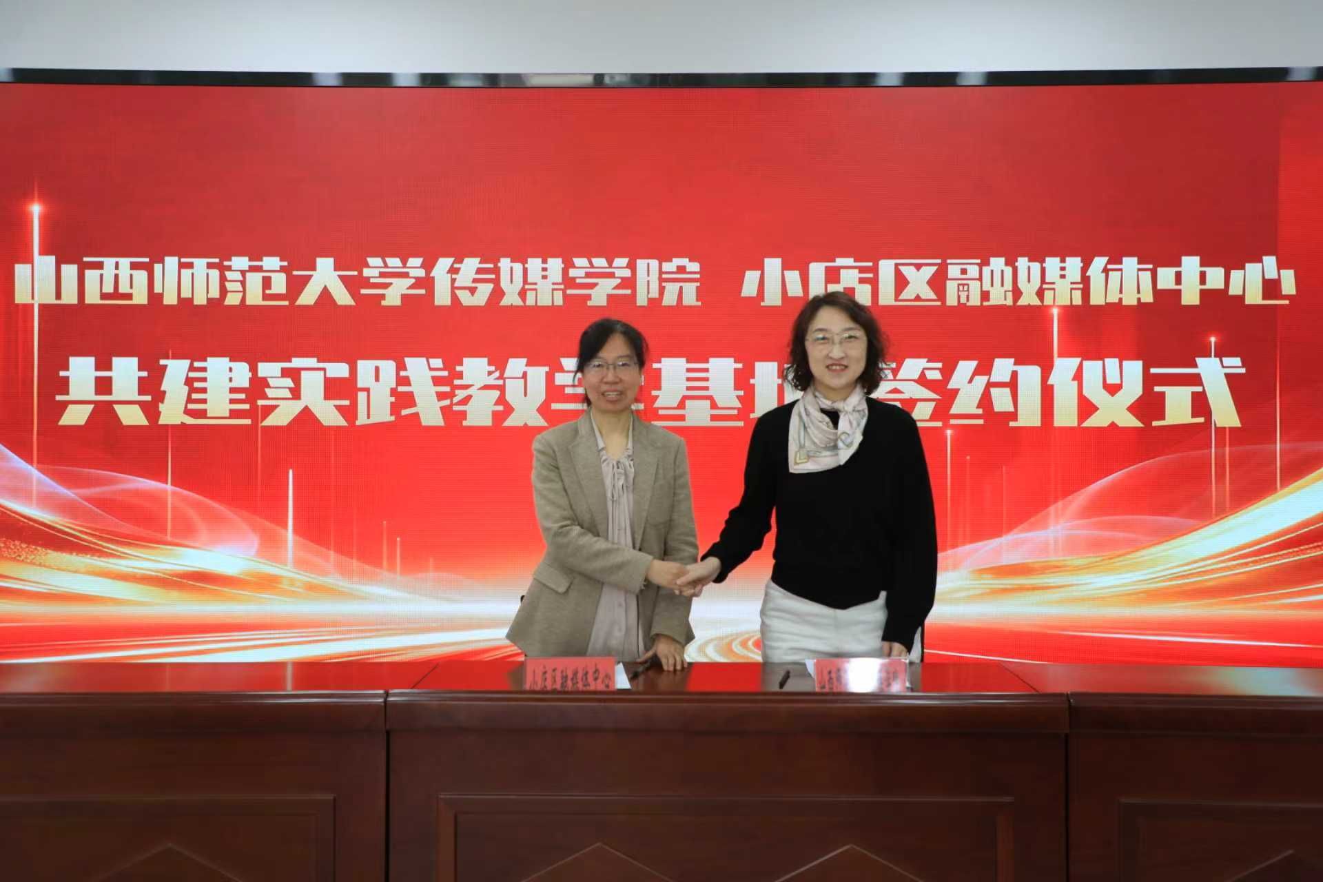 小店区委宣传部常务副部长苏曼对学院到访表示欢迎,希望双方基于实习基地建设,加强交流,共同推进高质量人才培养和主流媒体系统性变革。赵娟主任详细介绍了中心建设运营现状、当前发展中面临的挑战以及人才需求。院长周婧介绍了学院在传媒专业人才培养、学科建设等方面的基本情况。随后双方围绕实践基地建设、学生实习实训、选题内容共创等方面进行了深入探讨,达成广泛共识。座谈结束后,双方举行了共建实践教学基地签约仪式。
